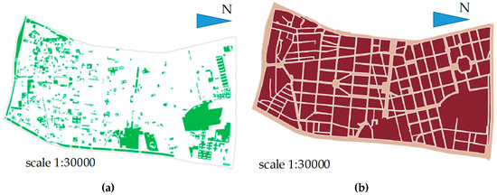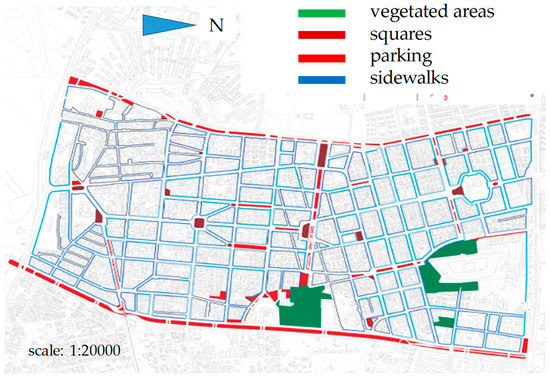 Regarding Figure 1b, the overall surface of pedestrian areas (sidewalks, square central islands and areas where motorized vehicles are not allowed, shared areas, and parking lots) is 149,914 m2 (i.e., 5.7% of the total surface of the quarter), as listed in Table 3.