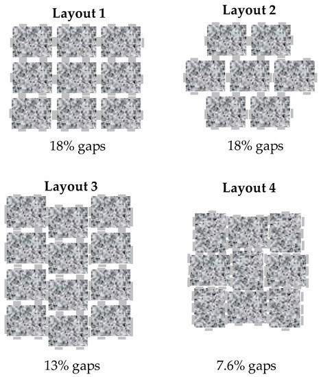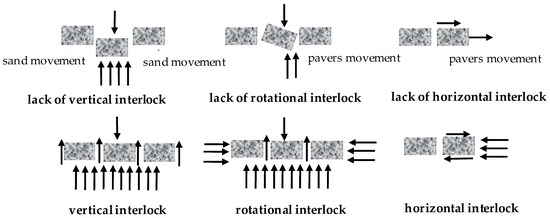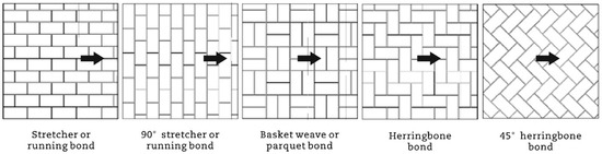 When modular pavements are built, block patterns affect both the structural response [41] and the permeability of the pavement [42]. The design of modular pavements in shared areas should comply with the design criteria adopted for continuous pavements: analysis of traffic loads, identification of the load-bearing capacity of the subgrade, and verification of fatigue damage in bound materials and rutting damage in unbound materials. Moreover, the vertical, rotational, and horizontal interlock of pavers should be verified because the inability of a block moving in isolation from its neighbors prevents premature functional decay of the pavement service life [43]. Regarding parallelepiped blocks (Figure 4), vertical loads (both symmetrically and asymmetrically applied to blocks) and horizontal forces induced by vehicles braking and accelerating cause paver displacements irrespective of the original laying pattern. Moreover, joint gaps should be 3–5 mm wide to permit joint filling and to ensure pavement durability [41].