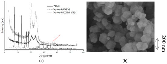 (a) XRD patterns for zeolitic imidazolate framework -8 (ZIF-8) nanoparticles, nylon 6,6 nanofiber membrane, and nylon 6,6/ZIF-8 NFM; (b) SEM image showing morphology of ZIF-8.