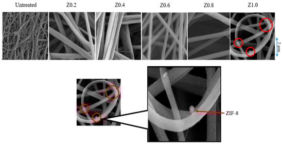 Figure 4 shows the FESEM images of the plain and electrospun nylon 6, 6/ ZIF-8 NFM. The morphology of nylon 6,6/ZIF-8 NFM shows notable changes in comparison with the untreated NFM. From the figure, it can be observed that at Z1.0 NFM, ZIF-8 nanoparticles have been embedded onto the membrane due to polymer-filler interface (see the red circles). Moreover, the fiber diameter started to increase up till 800 nm (Figure 5) as the weight percentage of ZIF-8 increased from 0.2% to 0.4%. This trend suggests that the addition of ZIF-8 changes the concentration of the dope solution.