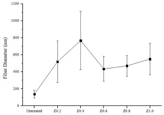 The greater loading of the additives causes higher concentration/viscosity of the dope solution (Figure 3), resulting in a larger polymer jet and leading to deposition of fiber with a larger diameter []. Moreover, the increase in fiber diameter will produce a membrane with bigger pore size [,]. This could happen as there is incomplete drying of NFM due to higher viscosity of dope solution [].