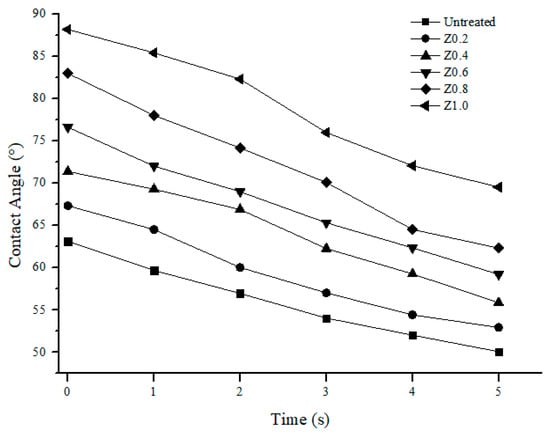 Figure 6 shows water contact angle vs. time for untreated nylon 6,6 NFM and nylon 6,6 NFM incorporated with ZIF-8. It was observed that the hydrophilicity of NFM decreases as the loading of ZIF-8 increases. This is due to the hydrophobic nature of ZIF-8 [] which hinders the water uptake. Apart from that, decrease in membrane hydrophilicity is also associated with the surface roughness. Rougher surface leads to lower interface energy due to a greater interfacial contact area between liquid and solid and hence increases the water contact angle [,]. Nevertheless, even though the water contact angle increases, it is still below 90°, which indicates that all of the membranes are hydrophilic.