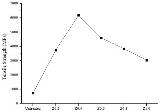 Figure 7 shows the graph of tensile strength between the untreated NFM and nylon 6,6 NFM/ZIF-8. As observed, the tensile strength of the NFM increases as the loading of ZIF-8 increases. Significant increment of tensile strength was observed at 0.4% loading of ZIF-8, 8× higher (6180 MPa) than the untreated nylon 6,6 NFM (738 MPa). The increment in tensile strength indicates that ZIF-8 and nylon 6,6 matrix have strongly interacted with each other [,].