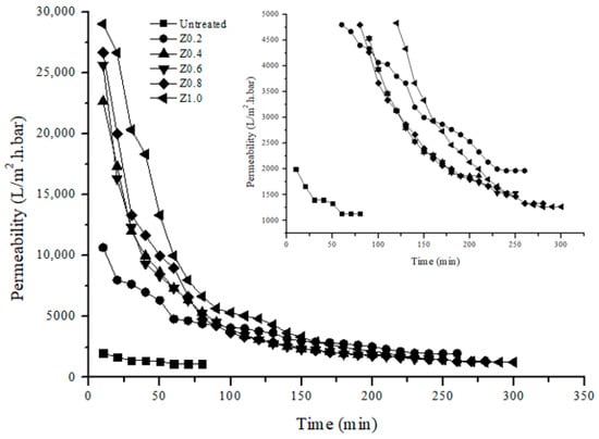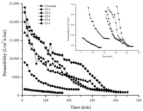 Figure 8 shows that the addition of ZIF-8 greatly increases the initial permeability of pure water which correlates with the pore size and porosity data in Table 1. The presence of ZIF-8 as a hydrophobic additive promotes the “deswelling effect” as the membrane pores are retained at their size, allowing more liquid to pass through without absorbing too much water, thus reducing membrane swelling. Usually, hydrophilic materials swell in water as water forms physical interactions with the material []. Due to this reason, the superhydrophilic membrane is sometimes not preferable to be used since it has greater water uptake, and therefore greater swelling effect. Swelling enlarges the fiber and eventually reduces the membrane pore size and water permeability []. Due to this phenomena, hydrophobic additive is preferred in this study in order to control the swelling effect.