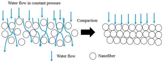 To address this issue, electrospun nanofiber membrane (NFM) has great potential to be used as a filter since it is found to be a more effective approach to reduce fouling []. Electrospun NFM is suitable to be applied in water treatment since it can handle the fouling problem better, has high porosity, and great surface area to volume ratio [,]. Usually, NFM is used for pre-treatment before nanofiltration or reverse osmosis processes []. Nylon 6,6 is also attractive to be used in the pre-treatment stage for removal of oils and particulate organics when aiming to reuse the treated PW. However, electrospun NFMs have poor mechanical strength because of random orientation within fibers, and have large distribution of fiber diameter [,].