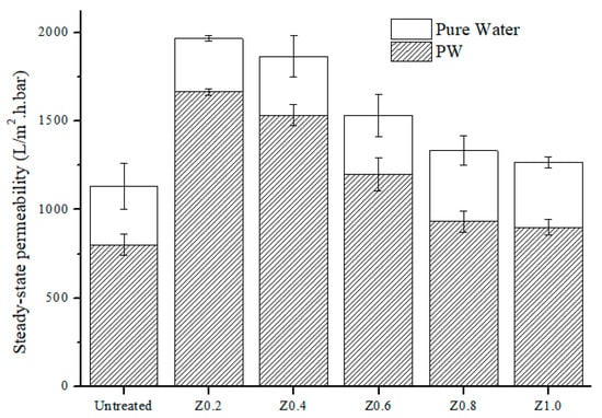 However, the permeability decreasing with time may be due to compression of the pores under the pressure. As time goes by, the “deswelling effect” slows down due to fouling, as can be seen in Figure 9 where at 1.0% loading of ZIF-8, it faces sharp decline due to higher hydrophobicity than other membranes. The hydrophobic nature of ZIF-8 favors more adsorption of oil, which then causes the oil to be accumulated and eventually blocks the membrane pores. Other than that, NFM membranes incorporated with ZIF-8 took a longer time to get fouled, where at Z1.0 NFM (Figure 9), the longest it took was about 6 hours. This is because the greater water uptake at the initial permeability and harder structure causes the membrane to take more time to achieve steady-state. Moreover, Figure 10 illustrates the membrane compaction process, which explains the reason for the membrane taking a longer time to achieve steady-state in PW treatment. Due to fouling phenomena, treatment for PW took a longer time compared to pure water. Normally, the water will flow freely through the pores until the membrane becomes compact, hence achieving a steady- state condition. However, as the feed changes into PW, the formation of cake layer on top of the membrane surface will block the pores. This will then delay the membrane compaction process since water will take more time to flow through the membrane, as there is not much presence of pores. The increase in membrane resistance prolongs the time taken for the membrane to achieve steady-state, as the cake layer needs to be compact along with the membrane. In addition, the highest steady-state permeability of 1967 L/(m2·h·bar)was observed at Z0.2 NFM (Figure 11) for pure water, and 1667 L/(m2·h·bar) for PW which are 2× higher than the untreated nylon 6,6 NFM.