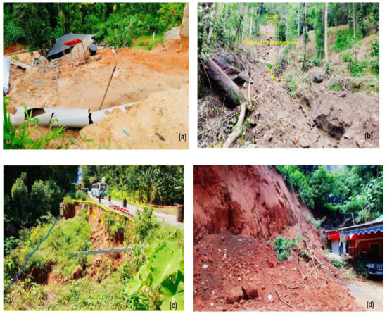 The scarps of the Western Ghats experience an annual rainfall as high as 5000 mm as a result of the southwest monsoon, northeast monsoon, and premonsoon showers [25]. The Western flank of the Western Ghats experiences landslides during the southwest monsoon and the eastern side is affected mainly during the northeast monsoon [20]. Large amounts of high-intensity rainfalls increase the pore water pressure within the soil mass, which eventually decreases the shear strength of the soil. This is considered as the primary triggering factor of landslides in the Indian Himalayas [2,4,26] and the Western Ghats [27]. The fissures in bedrock siphons the excess rainwater to unstable zones in the slopes during the monsoon [28]. Photographs of some landslides which happened during the 2018 monsoon are shown in Figure 2. The population of this region increased rapidly after the 19th century, as the people from the midlands started migrating into the hilly region [29]. The industrially backward district was in a quest for better infrastructure due to an increase in population. As an effect, the land use has changed significantly in a short span of time, which favoured the occurrence of landslides in the region. Large scale hill-toe modifications have been done in the district in recent decades for the purpose of infrastructure development, due to which the hill slopes have become steep, without any lateral support. The terraced slopes, modified for monoculture plantations with no sufficient drainage provisions, aggravated the scenario. Due to the drain blockages, water from the intense rainfall accumulates in the top soil layers, leading to landslides.