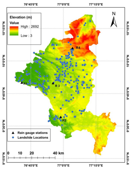 Digital Elevation Model [35] of the Idukki district along with the spatial distribution of landslide locations and rain gauge stations (2010–2018).