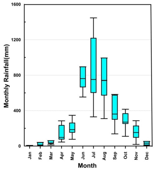 The rainfall data of daily resolution from the year 2010 was collected from four rain gauge stations in the Idukki district, maintained by the India Meteorological Department (IMD) [36], for the analysis. The locations of rain gauge stations are given in Table 1. The monthly distribution of effective rainfall in the Idukki district from 2010 to 2018 is shown in the box plot shown in Figure 4.