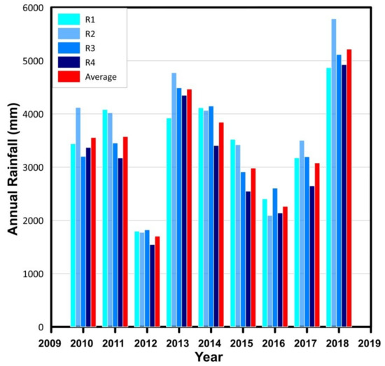 Variation of annual rainfall measured in four rain gauges during the study period.