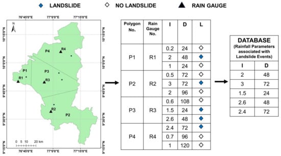 The method of developing a dataset is illustrated in Figure 6 [37] using a sample dataset, i.e, the values (I,D) and the locations of landslides are not from the actual dataset, but are arbitrarily chosen for demonstrating the methodology. For all landslide events that happened in Thiessen polygon P1, the readings from R1 are considered. The procedure was same for all landslide events.