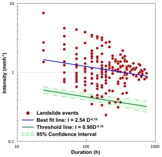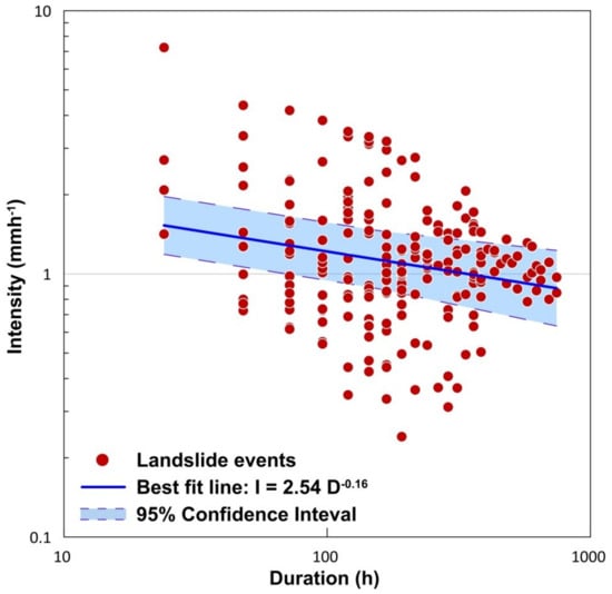 Use of this power-law equation has two fundamental assumptions. The first one is that with increase in the rainfall intensities, there is a nonlinear increase in the probability of occurrence of landslides. Below the threshold value, the likelihood of initiation of landslide is low, and above the threshold, the probability of occurrence of landslides increases nonlinearly. The second assumption is that the initiation of slides decreases as the duration of rainfall increases [2]. The term ‘β’ in Equation (1) defines this rate at which the critical intensity declines with the rise in duration. The frequentist approach of defining intensity-duration thresholds is used in this study. Empirical rainfall conditions which triggered landslides were first log-transformed and fitted using Equation (2), which is equivalent to the power-law in Equation (1). Using the Frequentist method, a best fit line for the distribution was obtained as I = 2.54D−0.16 (Figure 7) with a coefficient of determination (R2) of 0.04. The scattering of data results in a lower value of R2 and hence the uncertainty associated with the fitted line is evaluated with a confidence interval of 95%. Considering the uncertainties, Equation (1) gets modified to