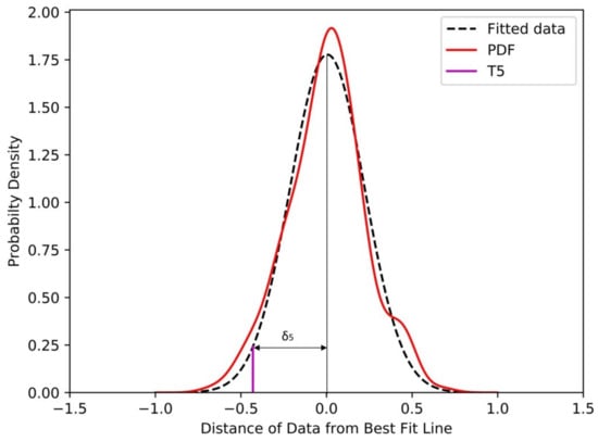 The data follows a distribution similar to the standard Gaussian distribution. Hence based on standard Gaussian distribution, a T5 line was plotted as in Figure 8, with an exceedance probability of 5%. The distance ‘δ5’ indicates the deviation of threshold line from the best fit line. This deviation was used to establish the intercept of the threshold line (Figure 9).