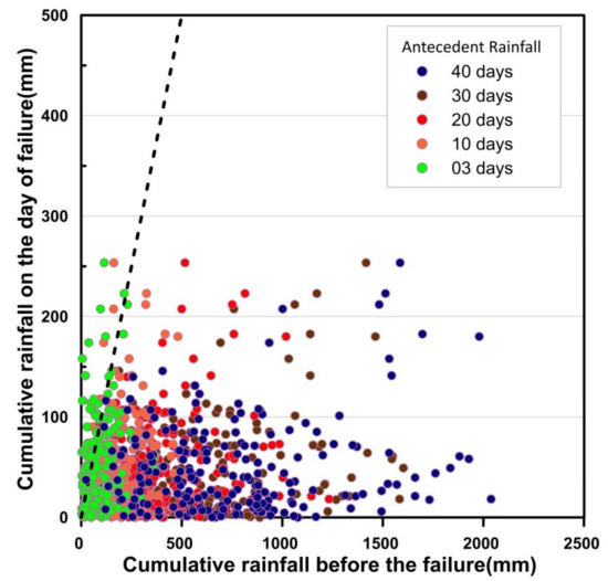 The data of 225 landslides over a period of nine years has been used for the analysis. Daily rainfall records at failure are compared with the antecedent rainfall of 3, 10, 20, 30, and 40 days before failure. The graph is plotted with antecedent rainfall (mm) and daily rainfall (mm) in x and y axes respectively. The diagonal line of the plot determines the scattering bias of the data (Figure 10).