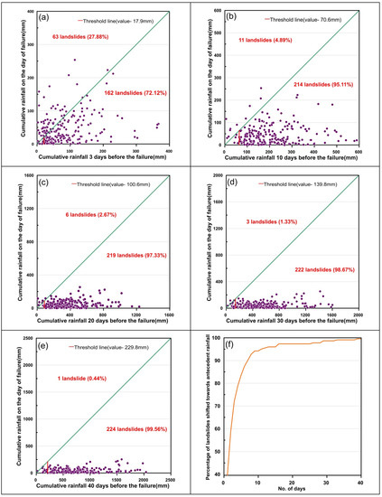 A significant share of landslide events is biased towards the antecedent rainfall in all cases. Hence a threshold is defined for all individual time durations of antecedent rainfall considered in the study as shown in Figure 11a–e. In the first case, three days’ antecedent rainfall was considered, 28% of the total events considered are shifted towards daily rainfall, and the remaining 163 landslides are biased towards three days’ antecedent rainfall. For other cases, the biasness ratio to daily rainfall and antecedent rainfall was found to be 11:214 for 10 days’, 6:219 for 20 days’, 3:222 for 30 days’, and 1:224 for 40 days’ antecedent rainfall prior to the slide event. It is evident from the analysis that the biasness towards antecedent rainfall, which was 72% in case of 3 days’ antecedent rainfall increased to 99.56% when the antecedent rainfall of 40 days was considered as shown in Figure 11f. The study can be refined if the temporal resolution of the rainfall data available is improved.