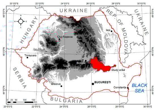 The Buzău river catchment is located in the south-eastern part of Romania at the cross between the historical regions of Muntenia and Moldova and is a left tributary of the Siret river with a total surface of 5264 km2. The catchment overlaps five counties—Brașov, Covasna, Prahova, Buzău and Brăila—and 116 territorial-administrative units. The Buzău river springs from the Ciucaș Mountains, located in the Curvature Carpathians, a southern group of the Eastern Carpathians, and has a total length of 302 km. The river has 32 left tributaries and 24 right tributaries (Table 1). The Buzău river drops 1242 m in elevation from its source, located at 1250 m from its mouth, where it confluences with the Siret river in the village of Voinești (Brăila county) at an altitude of 8 m. The Buzău river catchment has a circularity ratio of 0.24—a value which indicates that is has an elongated shape [].