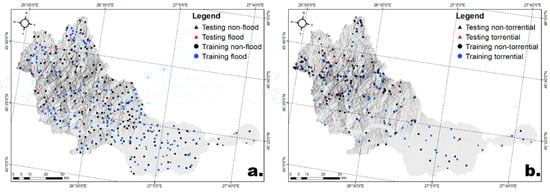 Location of flood and torrential areas (a) Flood/non-flood locations; (b) Torrential/non-torrential locations).