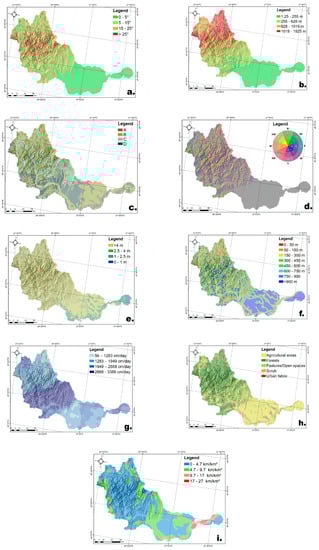 (a) Slope, (b) elevation, (c) hydrological soil group (HSG), (d) slope aspect, (e) elevation above channel, (f) distance from rivers, (g) saturated hydraulic conductivity, (h) land use, (i) drainage density.