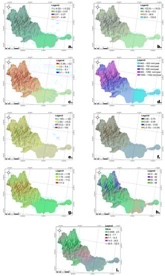 (a) Plan curvature, (b) Topographic Position Index (TPI), (c) Topographic Wetness Index (TWI), (d) multi-annual precipitation, (e) Convergence Index, (f) profile curvature, (g) L-S factor, (h) curve number, (i) soil erodibility by water.