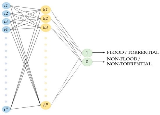 The hidden layers are also connected to the output layers through a neural connection which holds the output weights [,,,,,]. Initially, the weights of the connections hold random values until they intersect another connection—a phase in which they are multiplied by the associated weights and that intersection []. The interconnected neurons show the complex relationship between the input layers and the output layers—in this case, the flood/torrential or non-flood/non-torrential areas—and are also encoded with the values of 1 and 0 [,]. In order to avoid the overfitting of the neural network, the selection of the number of hidden neurons represents an important step as it controls the accuracy level of the network, proportionate to the noise level [,]. The number of neurons is determined based on Equation (5):