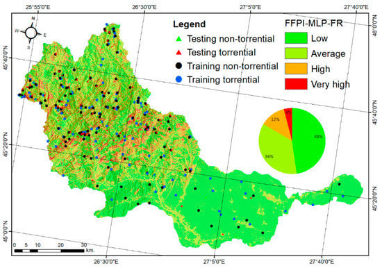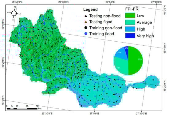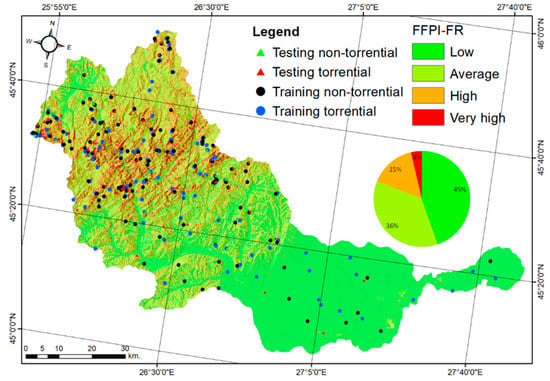 The FPI–FR and FFPI–FR models were classified into four hazard classes by using the Natural Breaks classification method in ArcGIS, as follows: low, average, high and very high. The resulting hazard map for the FPI–FR model shows that the low hazard class covers 50% of the catchment’s surface, the average class covers 30%, the high hazard class covers 16% of the area, and the very high hazard class covers 4%. The high and very high hazard classes are present in the lower catchment, where the slopes and altitudes are low, which is favorable for floods. The FFPI–FR model shows that 45% of the study area overlaps the low hazard class, 36% is in the average hazard class, 15% is in the high-hazard class, and the remaining 4% is characterized by areas with a very high hazard for flash-floods. The high and very high hazard classes are characteristic to areas with steep slopes in the upper basin, which are covered by pastures or areas with little or no vegetation.