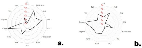 The areas affected by torrentiality have an almost equal distribution in all classes, but the class between (−3.15)–(−0.04) overlaps 29% of the torrential pixels, making it the class with the highest percentage of torrential areas. The L-S factor (Figure 4g) or the slope length and steepness factor was extracted from the soil threat dataset from ESDAC []. The L-S factor resulted from the combination of the length of the slope and the slope angle. This flash-flood conditioning variable shows the effects of the slope steepness and is used to determine the areas prone to soil erosion. This factor was classified into four classes ranging between 0.03 and > 11.2. Most of the torrential pixels—around 58.1%—overlap the class between 4.93–11.2.