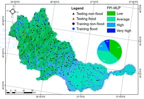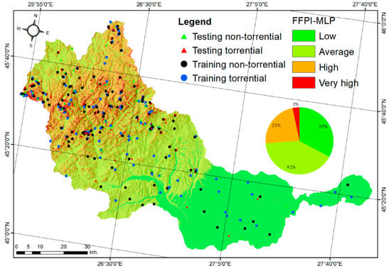 As for the FR model, the FPI and FFPI MLP model was classified into four hazard classes by using the Natural Breaks classification method. The FPI–MLP model shows that 37% of the study area is characterized by areas with a low hazard of floods, 41% by areas with an average-hazard, 15% by areas with a high hazard, and 7% was in the very high hazard class. As in the case of the FR model, the areas with average, high and very high hazard classes are located in the lower catchment. The slope, land use and distance from rivers were the variables with the highest importance values in the computation of the FPI–MLP model. The FFPI–MLP model shows that 41% of the study area is under the average flash-flood hazard class, which is predominant in the upper and middle part of the catchment. The low hazard class occupies 33% of the area, the high hazard occupies 23%, and the very high hazard class occupies 3% of the study area. The slope, multi-annual precipitation and the land use were the variables with the highest importance in the computation of the FFPI–MLP model.