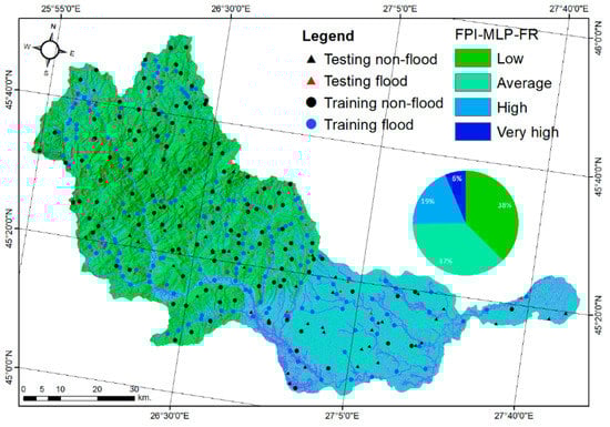 The role of hybrid models is to develop more accurate methods and reduce the potential disadvantages of the more traditional methods. The resulting hazard maps are shown in Figure 8 and Figure 9. The MLP–FR hybrid model was classified, as with the previous models, into four hazard classes by using the Natural Breaks method. The results indicate that for the FPI–MLP–FR model (Figure 11), 38% of the area are experience a low hazard of floods, while 37% have an average risk. The high and very high hazard classes represent 19% and 6% of the study area, respectively, and are located predominantly in the lower catchment in the proximity of the main water courses. The FFPI–MLP–FR (Figure 12) model shows that 55% of the catchment, especially in the lower catchment, is represented by areas with a low risk of flash floods. The average hazard class covers 36% of the study area, the high hazard class represents 12%, and the very high hazard class covers 4%. The very high values are mostly located in the middle part of the catchment. For both indices, the hybrid integration of both models proved to be the best-performing model. The flood and flash-flood hazard map (Figure 13) shows the areas which overlap the high and highest values of both indices.