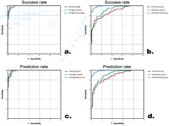 The performance evaluation of a model using the ROC (receiver operating characteristic) curve is a widely used method in research. The ROC curve represents a 2D plot which indicates the performance of a classifying system as the value of the discrimination cut-off is changed with respect to the predictor variable. The AUC (area under the curve) model represents a way to evaluate the testing ability in order to discriminate the true values. The ROC and AUC curves are made up from the sensitivity and specificity axes []. The success rate (Figure 14a,b) shows that the MLP–FR hybrid model was the best-performing model for both indices, with a value of 0.986 for the FPI and 0.952 for the FFPI, whilst the prediction rate (Figure 14c,d) shows the same trend. For both indices, the frequency ratio model proved to be the worst-performing model in terms of the success and prediction rate.
