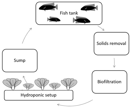 A schematic representation of an aquaponic system. The arrows indicate the water flow through the system.