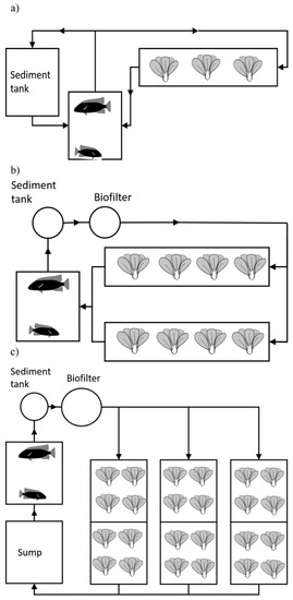 Schematic representation of Systems 1–3: (a) System 1, an F&D system with the mechanical filter and biofilter included in the pumice bed, (b,c) Systems 2 and 3 respectively, both DWC. System 3 had a larger volume for biofiltration and a sump for improved water quality and regulation of the water flow. Tilapia and pak-choi were cultured in this system.