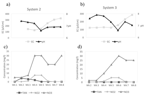 Biofilter stabilization in Systems 2 and 3: (a,b) show the measured conductivity (EC) and pH whereas (c,d) show the N-species dynamics in the system. All N-species are reported as N (TAN, NH4-N, nitrite, NO2-N, and nitrate, NO3-N). As ions accumulate in the system the EC rises whereas the pH drops because of the acidifying effects of nitrification. TAN rises at first, and as nitrifying bacteria establish, they eliminate TAN (NH4-N), the same happens with nitrite (NO2-N) as more bacteria populate the system. A fully mature system can be seen in Week 7 as TAN and nitrite are no longer detectable.