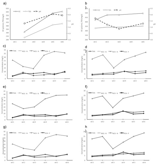The water quality was measured throughout the experiments in System 4 Trials 1 and 2 (Figure 5a–h). The inorganic N-species and phosphate concentrations were measured at different locations within System 4. Nutrient concentrations followed the same main trends throughout each trial of System 4 (Figure 5c–h). Statistical analysis indicated that the flow rate had no significant effect on plant growth (Table 3) nor nutrient removal within each grow-bed (Table 4). The drop in nitrate between Weeks 2 and 3 in Trial 2 was due to an interruption in feeding (Figure 5d,f,h), as a result of system failure. Table 5 shows the dissolved macro- and micronutrients (mg/L) in water samples from selected sampling points in System 4 Trial 2. An overall increase in concentration of essential elements soon after Week 1 has been detected throughout the system, especially the macronutrients (Table 5), indicating that the system has the potential for higher plant yield than tested in the present study.