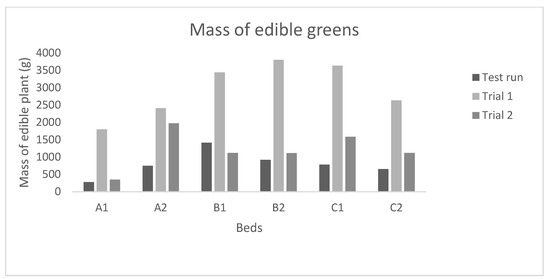 Pak-choi yield (biomass, fresh weight of whole plants without roots) from System 4. The test run included the initial stages of the system where nutrients were still accumulating, and the bacteria were still settling in the system. Trial 1 was during the summertime when the ambient light was present for 22 h/day. Trial 2 was during the winter with ambient light only present for 4 h/day and low indoor temperature.