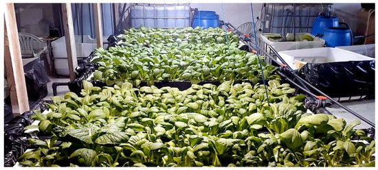 Different plants were grown in the systems (Table 2). In System 1, various species were tested, including fruiting vegetables (tomato, pepper, and okra), leafy vegetables (pak-choi and komatsuna), salad (watercress) and herbs (basil). In Systems 2 and 3, rucola salad and herbs including basil, coriander, and mint were selected for growing in the greenhouse facility. On the other hand, only the leafy vegetable species pak-choi was grown in System 4. All plants were grown within seeds. The fresh weight of tilapia and pak-choi produced was measured to calculate the mass balance of production for each trial. Biomass, or other forms of yield such as seed yield or fruit harvest, always has a direct correlation to the plant’s net photosynthetic rate, plant productivity [28,29], and is the main quantitative measure of a successful horticultural practice. However, in the context of aquaponics, especially during the designing and optimization stages as in the present study, biomass can be used to indicate plant metabolism and health, due to the efficiency of mineral nutrition and uptake by the roots.