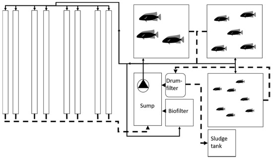 Decoupled systems vary from the traditional aquaponics system in that the aquaculture and hydroponic parts of the system are not joined in a closed loop. Instead, the fish are raised in a traditional RAS manner with optimized conditions for the fish’s growth. Water is exchanged in the system typical of RAS systems but instead of disposing of it, the water is used for irrigation in a traditional hydroponic unit. This decoupling allows for optimization of each individual production part of the system and gives the freedom of selecting fish and plant species that have separate needs [7,53]. The system developed for the greenhouse is partly decoupled as part of the water from the aquaculture system is used for fertilizing the soil.