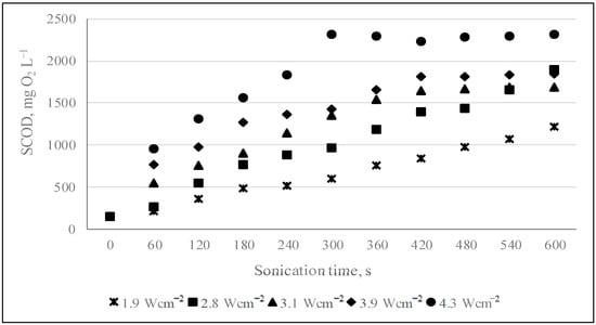 Changes of the SCOD value in the ultrasonic disintegration process for the tested ultrasound field intensity values depending on the sonication time.