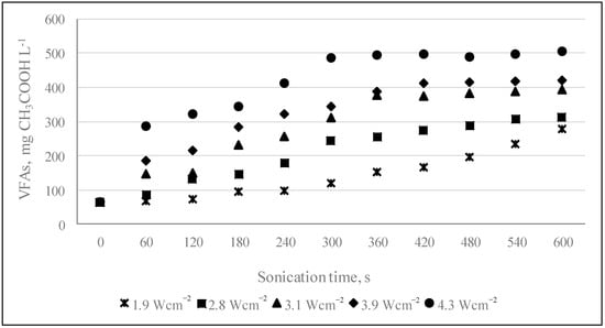 With the increase of ultrasound wave intensity and sonication time, an increase in the concentration of VFAs was noted. The highest VFAs concentration was observed for the ultrasonic wavelength of 3.78 W cm−2 and the sonication time of 300 s. It is observed that the increase of VFAs concentration correlated with the increase of SCOD value. The most favorable disintegration conditions were the ultrasonic field strength of 4.3 W cm−2 and the sonication time of 300 s resulting in an increase of SCOD and VFAs, respectively, with respect to unprepared sludge. Figure 3 presents changes of the total organic carbon values of sonicated excess sludge.