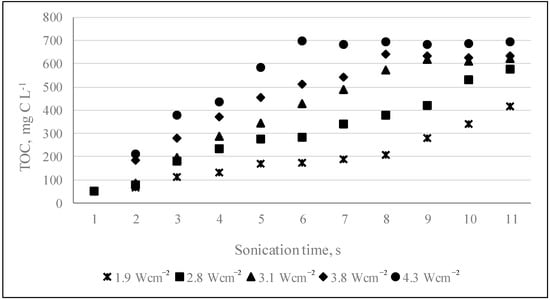 Changes of the TOC values in the ultrasonic disintegration process for the tested ultrasonic field intensity values depending on the sonication time.