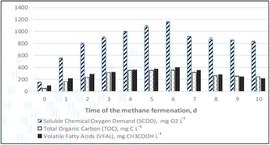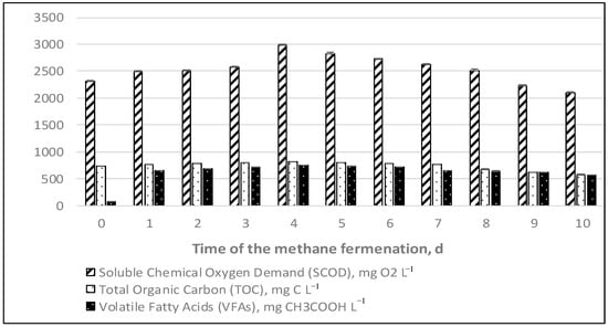 The process of 10-day methane fermentation was subjected to unprepared sludge. Changes of chosen physico-chemical parameters of sludge in the 10-day conventional methane fermentation process of sludge are presented in Table 2. Figure 4 shows the changes of SCOD, TOC, and VFAs values in the methane fermentation process of unprepared excess sludge.