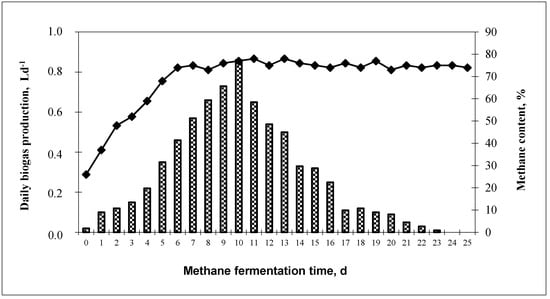 During the methane fermentation of unprepared sludge, the highest value of daily biogas production of 0.86 L was observed on the 10th day of the process, with a content of approximately 77% of methane. In the first 10 days of the process, a gradual increase in methane content was noted. In the following days of methane fermentation stabilization methane content in biogas was observed. The total and biogas yield was 7.34 L and 0.303 L g VSS−1, respectively.