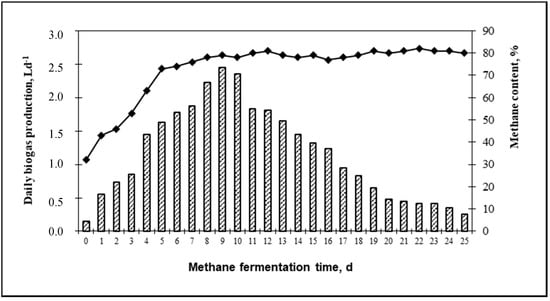 After the methane fermentation process, about 37% of the digestion degree was obtained, calculated by the loss of volatile suspended solids and about 30% of the total solids reduction. Figure 5 shows the biogas production process, including methane content, in the process of anaerobic stabilization of unprepared excess sludge.