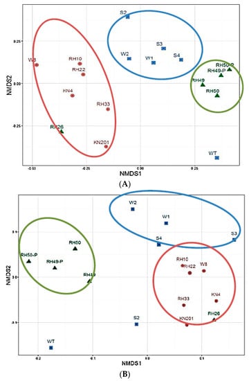 Nonmetric multidimensional scaling (NMDS) ordination for the microbial communities in the examined 17 boreholes using (A) the Bray-Curtis distance matrix, and (B) the weighted UniFrac distance matrix. Groups are categorized according to borehole location in the industrial area (symbols and colors), green triangles represent the Production plan, blue squares, the Wadi Hovav; red circles indicate Downstream. Circles represent clustered groups according to borehole location in the industrial area. Distance matrix based on 16S rRNA Illumina sequencing. Stress: (A) 0.153 (B) 0.098.