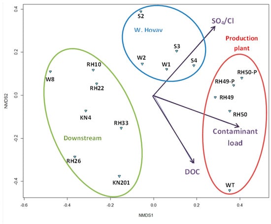 The effect of various environmental parameters: EC, pH, ion ratios, total nitrogen (TN), DOC, and contaminant load (Tables S2 and S3) on the 2015 groundwater microbial communities was tested, with the assistance of the Envfit function in the vegan package (R). From all tested parameters, only DOC, SO42−/Cl− and contaminant load were found to have a significant influence (p = 0.05) on the groundwater microbial community structure (Figure 3). As the ordination used is unconstrained (NMDS), this correlation is not linear. The use of Envfit enabled the identification of environmental parameters with a significant effect on the groundwater microbial communities. This projection shows that in groundwater areas with high contaminant levels, this is the most dominant factor affecting the communal microbial structure. In areas where contamination is low, its effect is not significant, and in those areas the microbial variability is high, making it more challenging to identify the main environmental parameter/s if they exist.