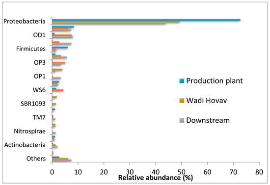 The production plant area is dominated at the Phyla level by Proteobacteria (72.7%), Bacteriodetes (8.4%), and Firmicutes (6.0%), with all other phyla beneath 2%. The dominance of these three phyla in the most contaminated area can be attributed to their ability to adapt to contaminated and diverse environments [,,]. With contaminant load decrease, more phyla with abundance greater than 2% appear in Wadi Hovav; Proteobacteria were (49.3%), Bacteriodetes (8.4%), six phyla had an abundance between 2–8%, and all the rest were <2%. In the downstream area Proteobacteria were (43.3%) dominated, eight phyla had an abundance of between 2–8% and the rest are below 2%. In addition, the percent of other phyla that were below 1% increase from the production plant downstream. Combining diversity with relative abundance data reveals that in the production plant area a lower amount of rare taxa exists. With distance from the production plant, as the contaminant load decreases, the amount of rare taxa increases (Figure 4).