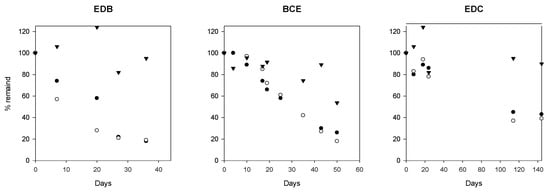 Degradation of Dibromoethane (EDB), 1-bromo-1-chloroethane (BCE) and 1,2-dichloroethane (EDC) by fresh RH49 groundwater microbial community. Open and filled circles represent individual sample bottles and filled triangles represent autoclaved control bottles.