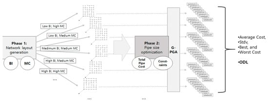 To quantify and compare the ODLs of WDNs, an ODL examination framework is proposed with two phases: (1) layout generation and (2) WDN design optimization (Figure 1). In Phase 1, a set of layouts with different degrees of branchedness and loop density is generated from a grid network. In Phase 2, WDN optimal designs are sought with randomly generated solutions to the layouts to compute the statistics for the final solution quality.