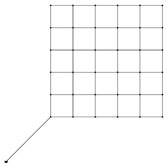 The above methodologies were applied to the B-city network [], which consists of 36 nodes and 61 pipes (Figure 2). The total source reservoir head is 80 m (262.5 ft). The B-city network has 2 × 2 km (1.24 × 1.24 mi) grids and consists of a districted residential area. The network needs to supply 3409.2 L/s (54,037 gpm) of water, and each node has a demand of 94.7 L/s (1501 gpm).