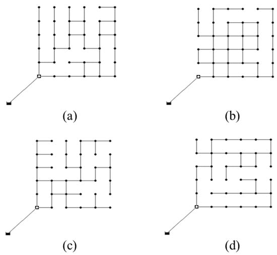 In order to identify any correlation between the ODL and two WDN topological measures, 25 pipe layouts were generated with a range of BIs and MCs. The measures were discretized, and each combination was assigned to a pipe layout. For example, the BI was discretized to 0.02, 0.1, 0.2, 0.4, 0.6, 0.77, 0.85, 1.0, and so on, whereas the MC was discretized to 0.0, 0.1, 0.16, 0.2, 0.3, 0.4, and so on. Hwang and Lansey [] classified a WDN as branched when BI ≥ 0.5 and looped if not. They considered MC = 0.2 as the critical value for whether a network is dense or sparse. In total, 30 independent design optimizations were performed, beginning from identical sets of randomly generated solutions for a fair comparison of different pipe layouts. Figure 3 shows some of the pipe layouts generated in Phase 1 that were used for the numerical experiments.