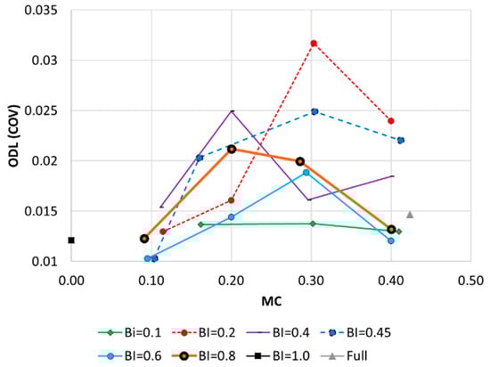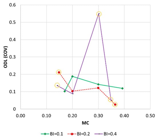 Although some stochastic patterns were observed, a concave plot was commonly obtained regardless of the network’s BI. The highest ODL value was observed at MC = 0.2–0.3, and low- and high-MC networks (i.e., MC = 0.1 or 0.4) had low ODL values. For example, in networks where the BI = 0.8, the ODL increased from 0.0123 at MC = 0.09 to 0.0212 at MC = 0.2 (72.4% increase), while it decreased from 0.02 at MC = 0.29 to 0.0132 at MC = 0.4 (34% decrease). Therefore, the ODL was highest in medium-meshed (medium-dense) networks with a mixture of branches and loops. An overly dense network has a relatively low ODL (Figure 4).